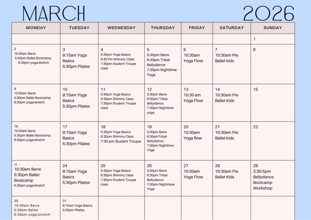 - 6:30 pm Shimmy Beginning Belly Dance.