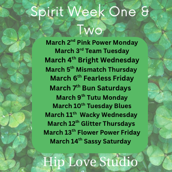 Join me at the studio for March Madness! Grab a friend if its your 1st time you get 1 class free! Purchase a unlimited class pass by Feb. 28th and grab the extra discount! Join me for 31 days of movement via all my social media accounts! Registration is now open for ALL Classes! We are also having Spirit Month at the studio! Check out the first 2 weeks below: