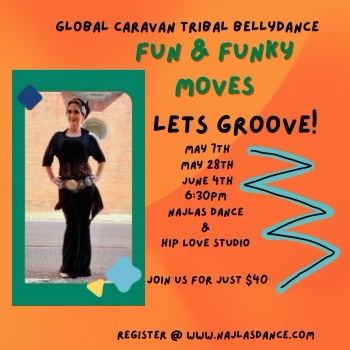 - 6:30 pm Tribal Bellydance (Global Caravan Style): Dates: May 7th, May 28th and June 4th for $40/3 classes