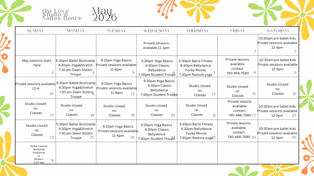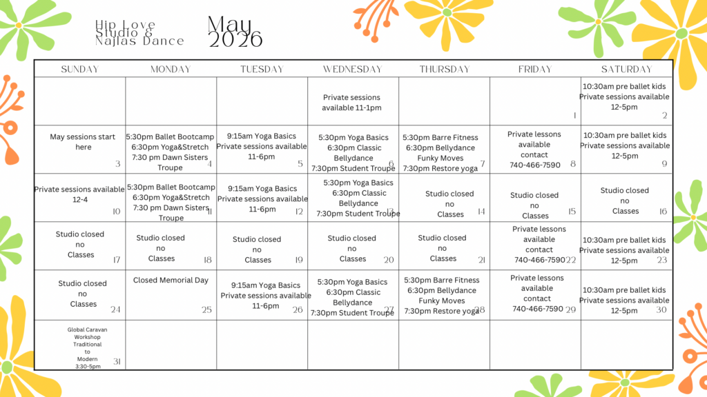 May Schedule! Please note: Studio will be closed from May 14th-May 21st. Classes and/or tuition have been adjusted for this month.